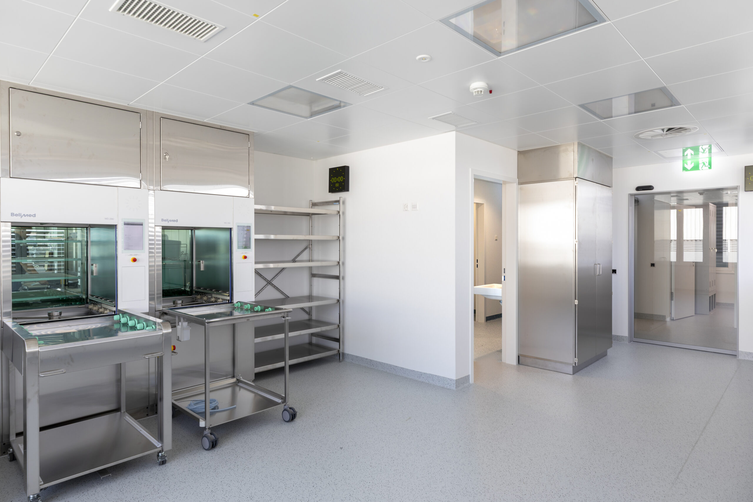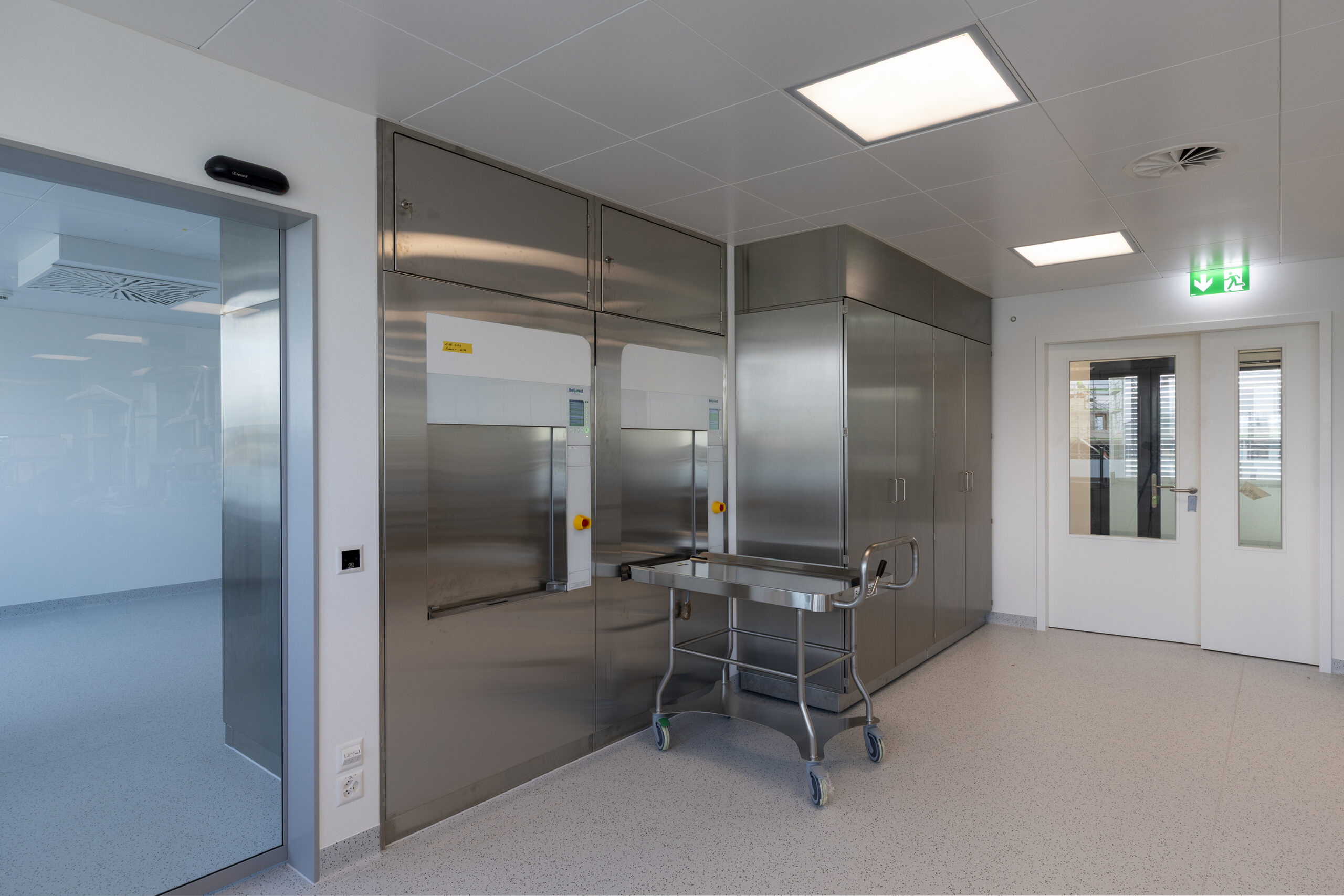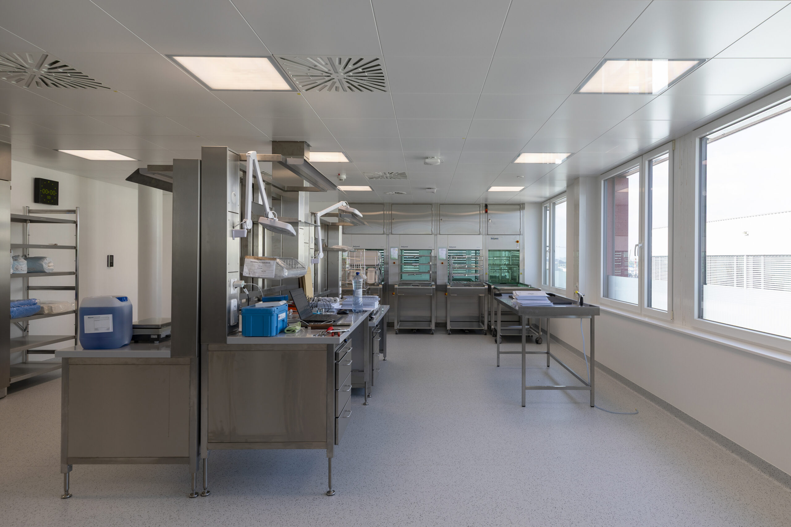 Die Praxisklinik Rennbahn AG realisierte im Rennbahncenter eine neue Aufbereitungseinheit für Medizinalprodukte (AEMP) im 7. Obergeschoss. Damit wurden die Konformität, Versorgungssicherheit und die langfristige Wachstumsfähigkeit der Medizinalprodukte-Aufbereitung nachhaltig Inhouse sichergestellt. Ein zusätzlicher Personenaufzug gewährleistete die direkte Anbindung an die Operationssäle im 2. und 3. Obergeschoss, während die bisherige Anlage im 2. Obergeschoss umgenutzt wurde.