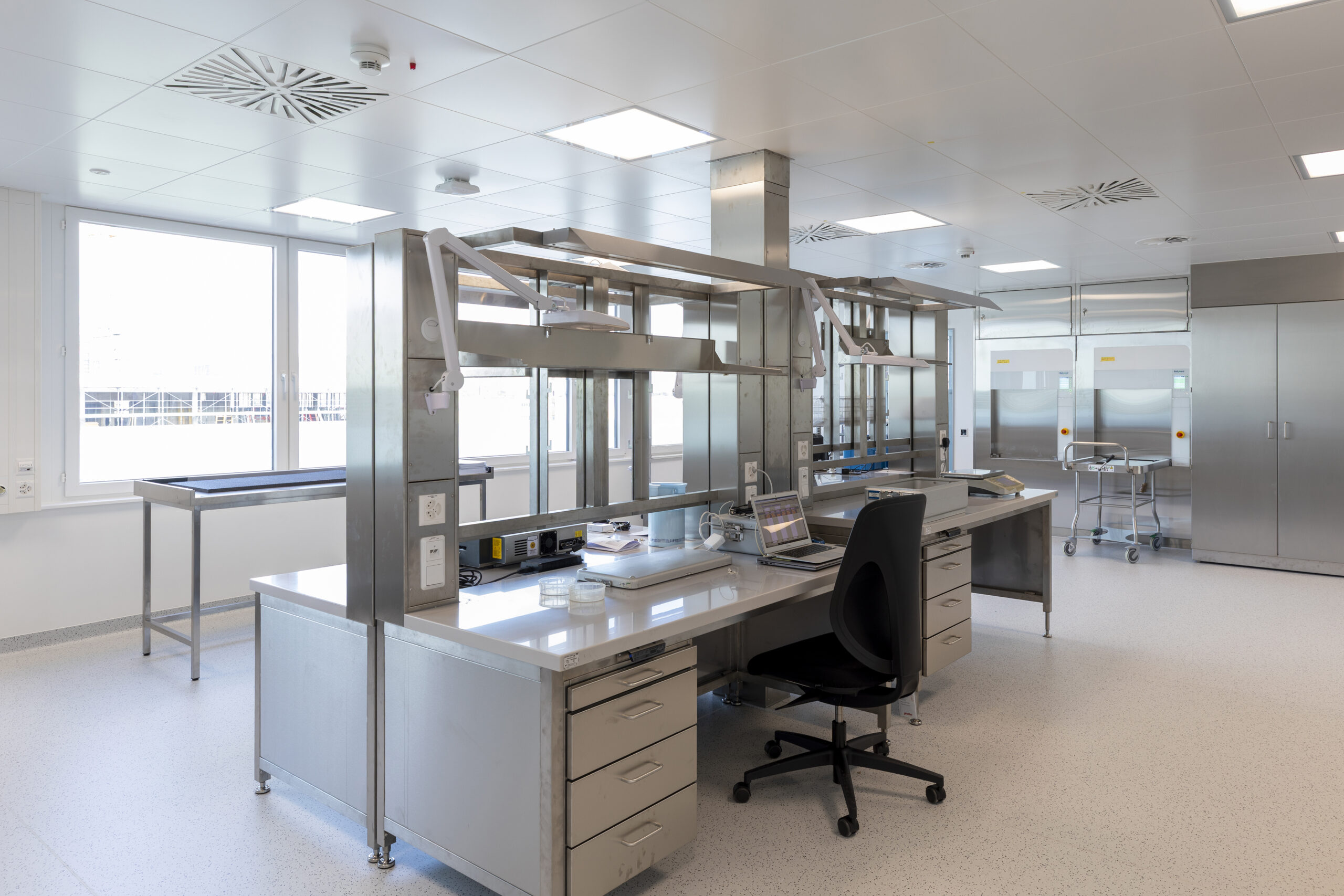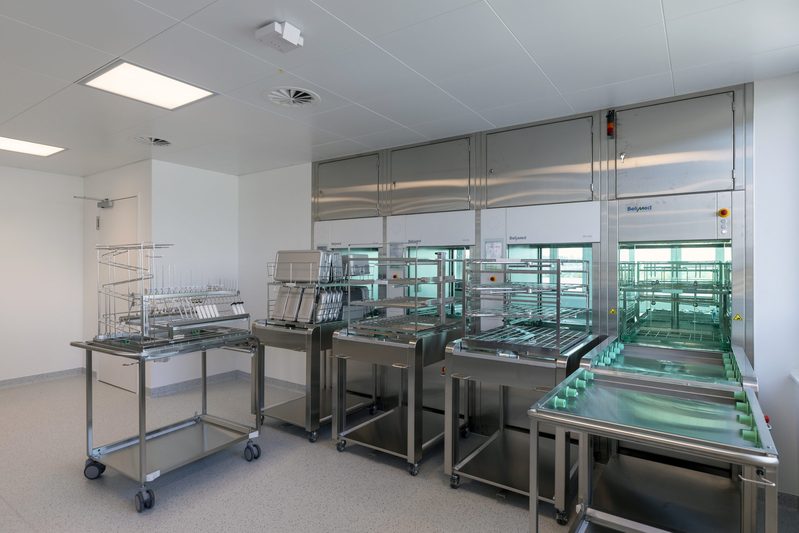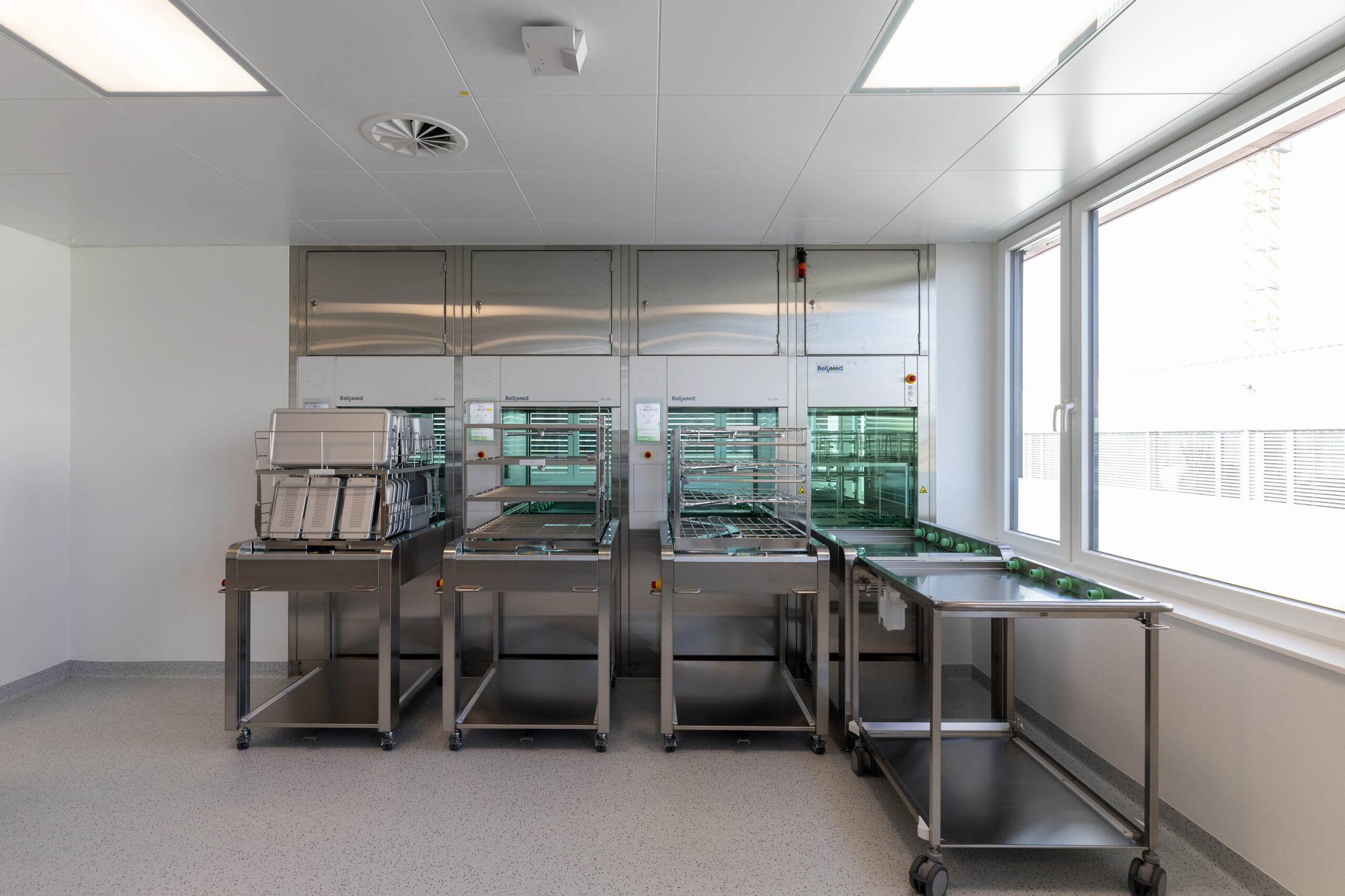 Die Praxisklinik Rennbahn AG realisierte im Rennbahncenter eine neue Aufbereitungseinheit für Medizinalprodukte (AEMP) im 7. Obergeschoss. Damit wurden die Konformität, Versorgungssicherheit und die langfristige Wachstumsfähigkeit der Medizinalprodukte-Aufbereitung nachhaltig Inhouse sichergestellt. Ein zusätzlicher Personenaufzug gewährleistete die direkte Anbindung an die Operationssäle im 2. und 3. Obergeschoss, während die bisherige Anlage im 2. Obergeschoss umgenutzt wurde.